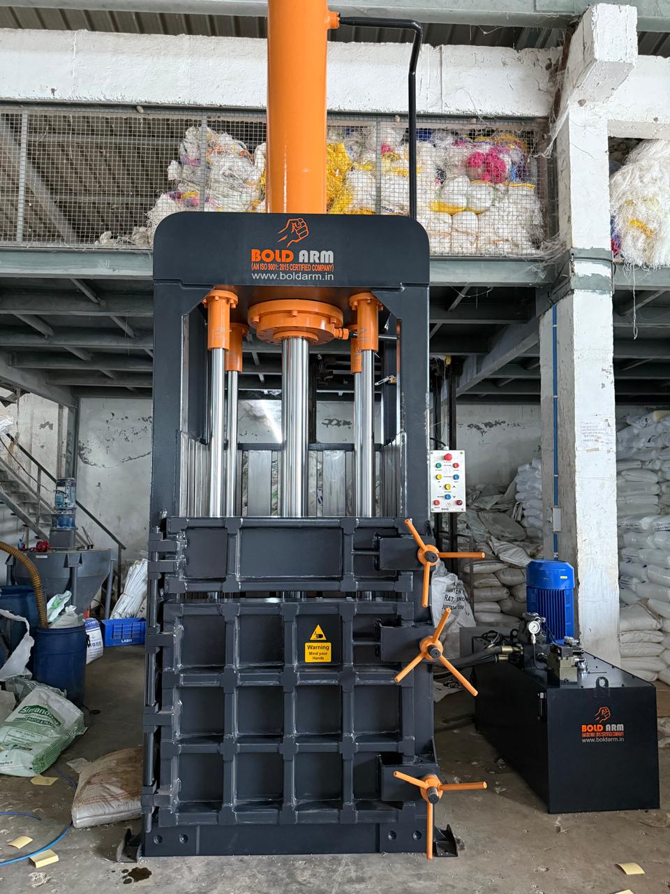 Jumbo Bag Bale Press Manufacturers We are also supply in Andhra Pradesh, Arunachal Pradesh, Assam, Bihar, Chhattisgarh, Goa, Gujarat, Haryana, Himachal Pradesh, Jharkhand, Karnataka, Kerala, Madhya Pradesh, Maharashtra, Manipur, Meghalaya, Mizoram, Nagaland, Odisha, Punjab, Rajasthan, Sikkim, Tamil Nadu, Telangana, Tripura, Uttar Pradesh, Uttarakhand, and West Bengal Capacity: 100 Ton to 150 Ton. Platen Size: 900mm X 1100mm Slits On Both Axis Custom Made Design are Available. Main Cylinder: One Cylinder Designed for FIBC Press Which has Extra-long piston And gland, therefore we Solve leakage and Road scratching Problems. Pusher Cylinder: Hydraulic Double Acting Pusher Cylinder with extra-long Rod high carbon based for hassle free pop out a bale and longer durability pushing system. Oil Reservoir: 450 Ltr. (use enclo 68 hydraulic oil) Electrical Motor: 15 Hp/20 Hp/ 25 Hp Operating System: Electrical Panel with Flexible Cords. (Handy Remote) FASTEST MACHINE IN CATEGORY BOLD ARM Main Features More Sturdy 35, 40& 45mm Plates used in Three Side Closed Body Construction Which Has Used Seamless Tubes and One Side Open able Door. FIBC Cylinder: Rod diaØ160, Ø180, Ø190 mm (as per tonnage capacity) for extra durability. With SS304 03mm Cladding on Base and Moving Solid blocks/ SS304 02mm Cladding on Side walls with zero step welding Well Designed Power Pack Unit Which Provides Extra Pressing Force and cylinder travelling Speed, Save Electricity and time.